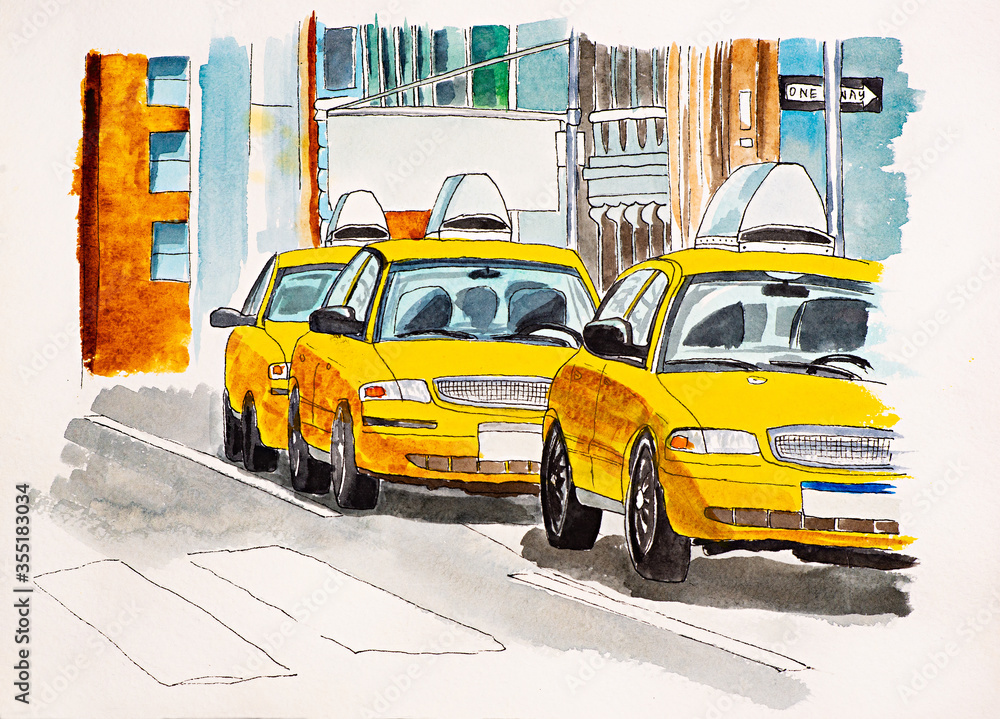 New York Street Scene Illustration Hand Drawn Watercolor Sketch Manhattan With Cars Taxis Traffic Lights Postcards Design Lettering Yellow Cabs Stock Illustration Adobe Stock